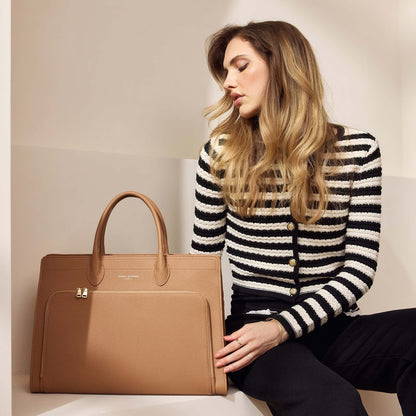 - Koordineret elegance: Designet i matchende kamelfarvet kalveskindslæder for et poleret, sømløst look.