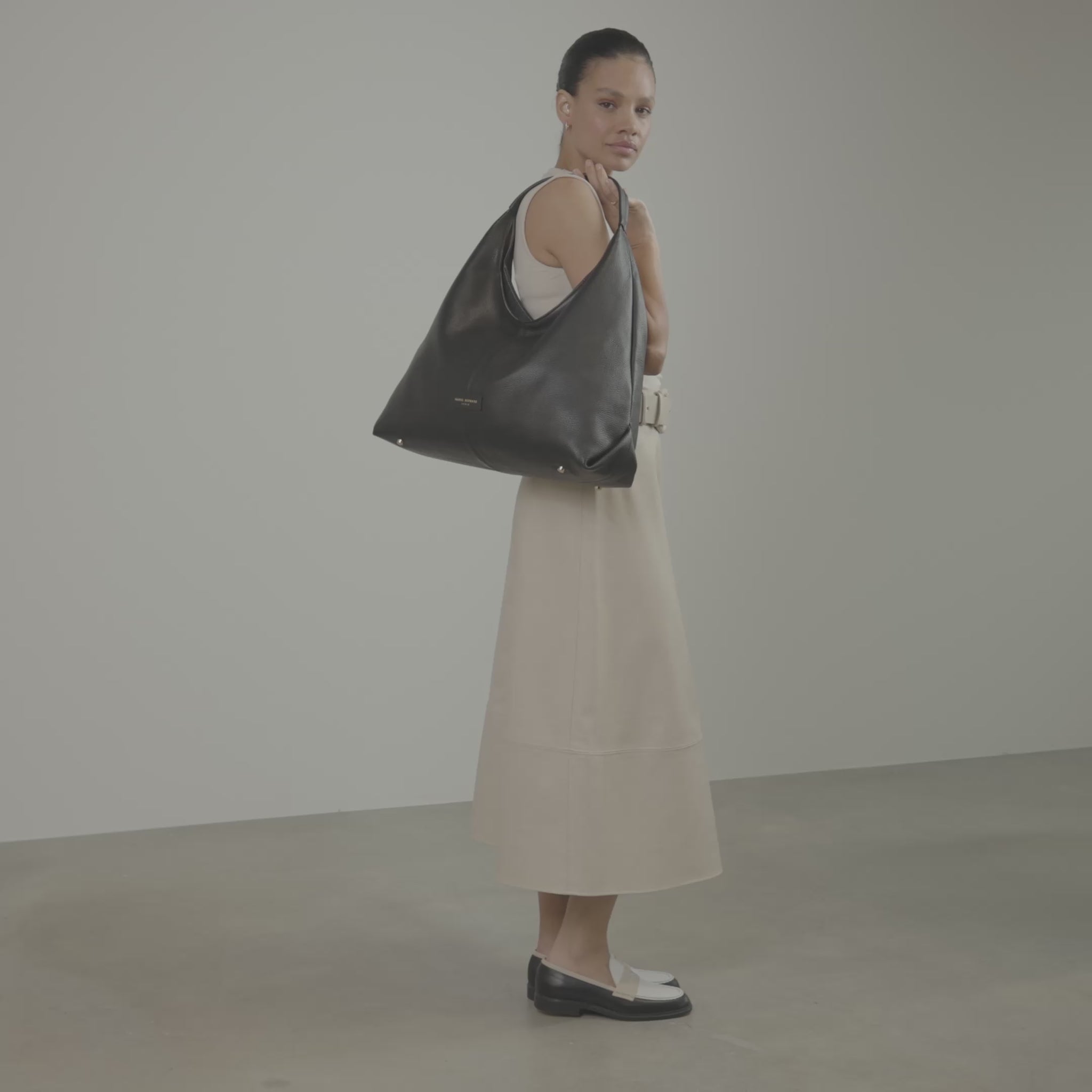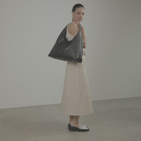 Løft dit professionelle ensemble med Isabel Bernard Honoré Grace sort kalveskindsskuldertaske-en harmonisk blanding af elegance og praktisk anvendelighed. Tasken er fremstillet af førsteklasses kalveskindslæder og udstråler ikke kun raffinement, men lover også holdbarhed og bliver mere smidig og smuk med tiden.