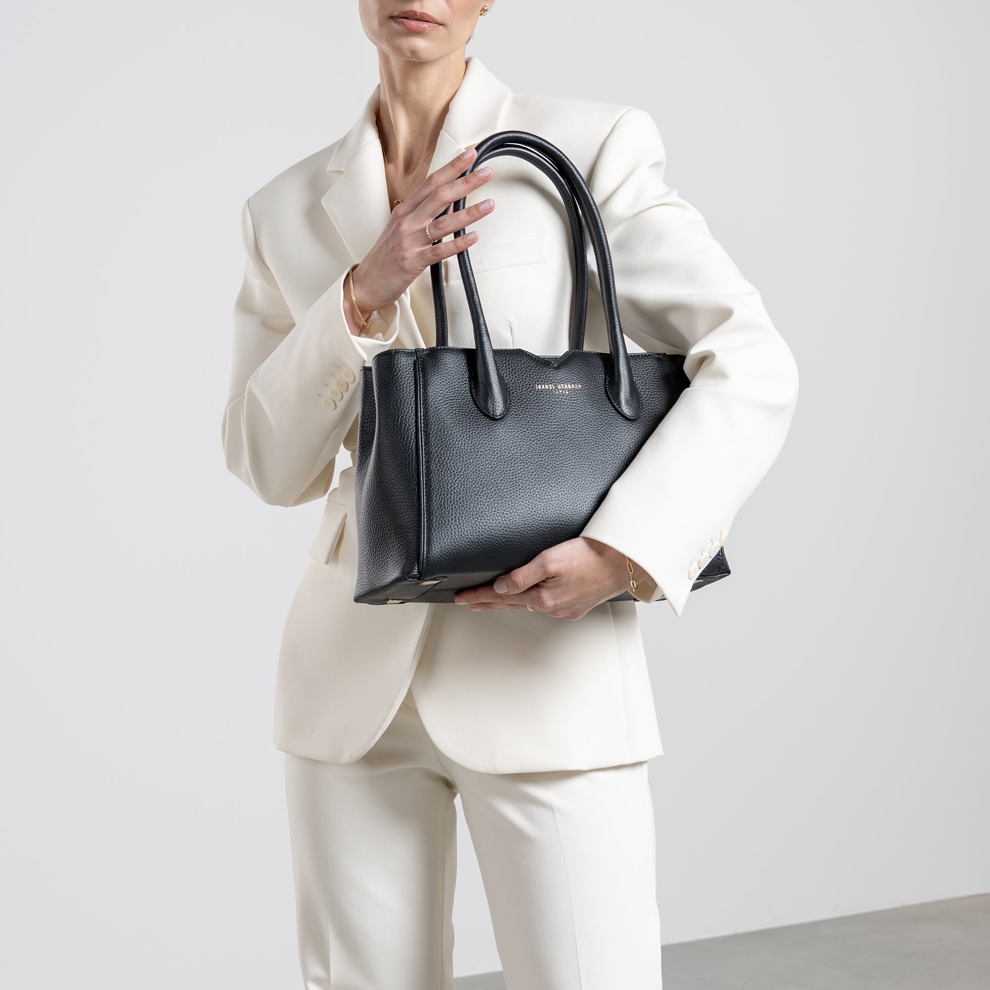 Die schwarze Handtasche aus Kalbsleder von Isabel Bernard ist die perfekte Kombination aus moderner Eleganz und zeitloser Funktionalität. Mit ihrer klaren Form und hochwertigen Verarbeitung wird sie zum stilvollen Begleiter für jeden Tag.