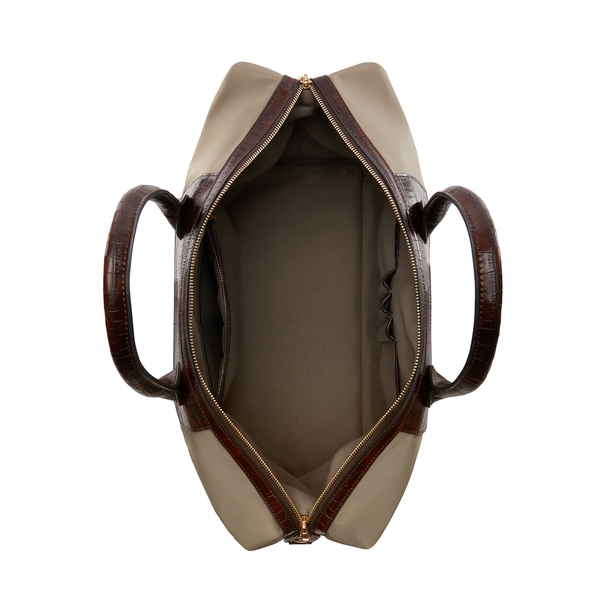 In stilvollem Taupe präsentiert sich diese Weekend Bag von Isabel Bernard als eleganter Begleiter für kurze Reisen. Mit ihrer klaren Form und goldfarbenen Details passt sie perfekt zur modernen, anspruchsvollen Frau.