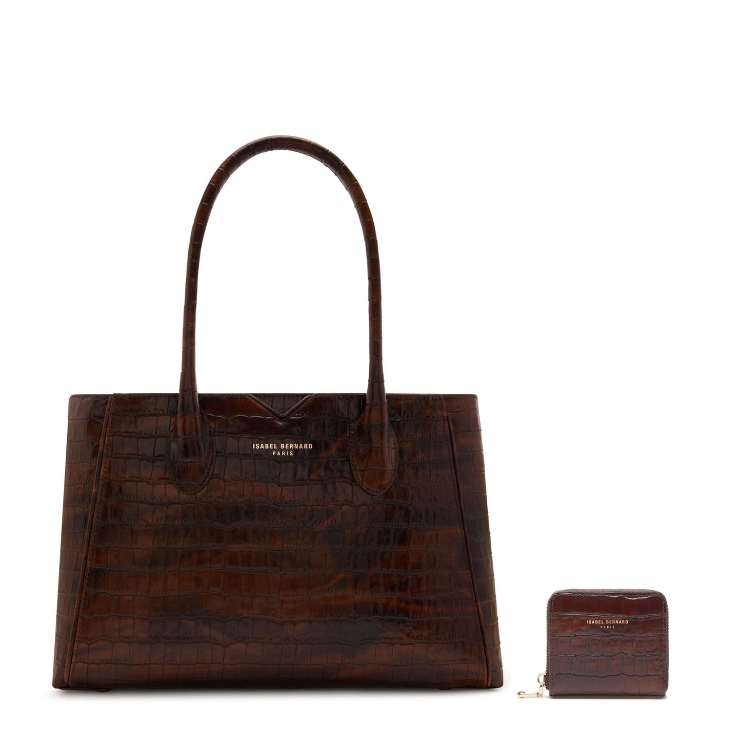 Cadeau d'Isabel sac à main en cuir croco marron et portefeuille