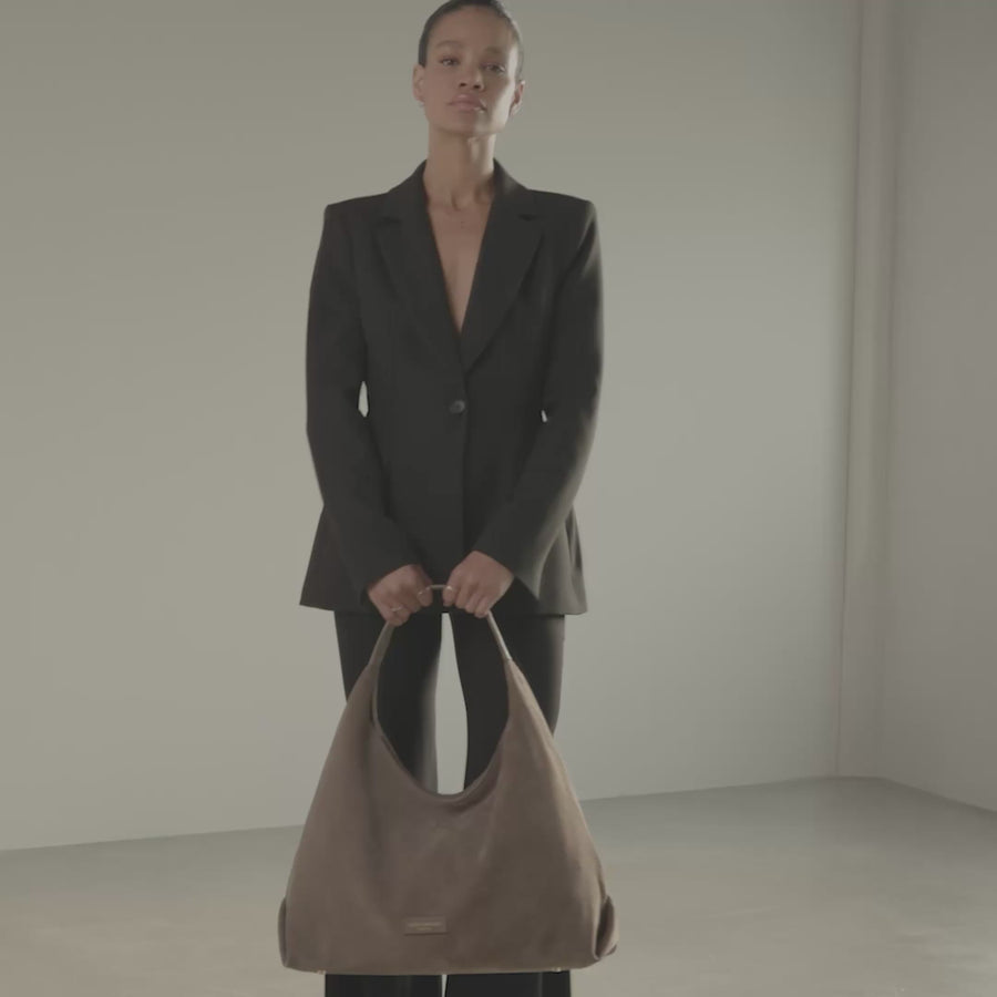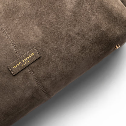 Présentation de la Isabel Bernard Honoré Sac à bandoulière en daim Grace Taupe-Un mélange harmonieux d'élégance intemporelle et de fonctionnalité moderne, conçu pour la femme professionnelle exigeante.