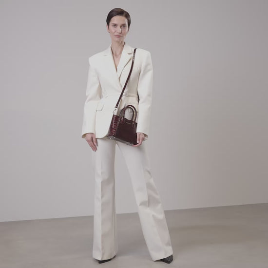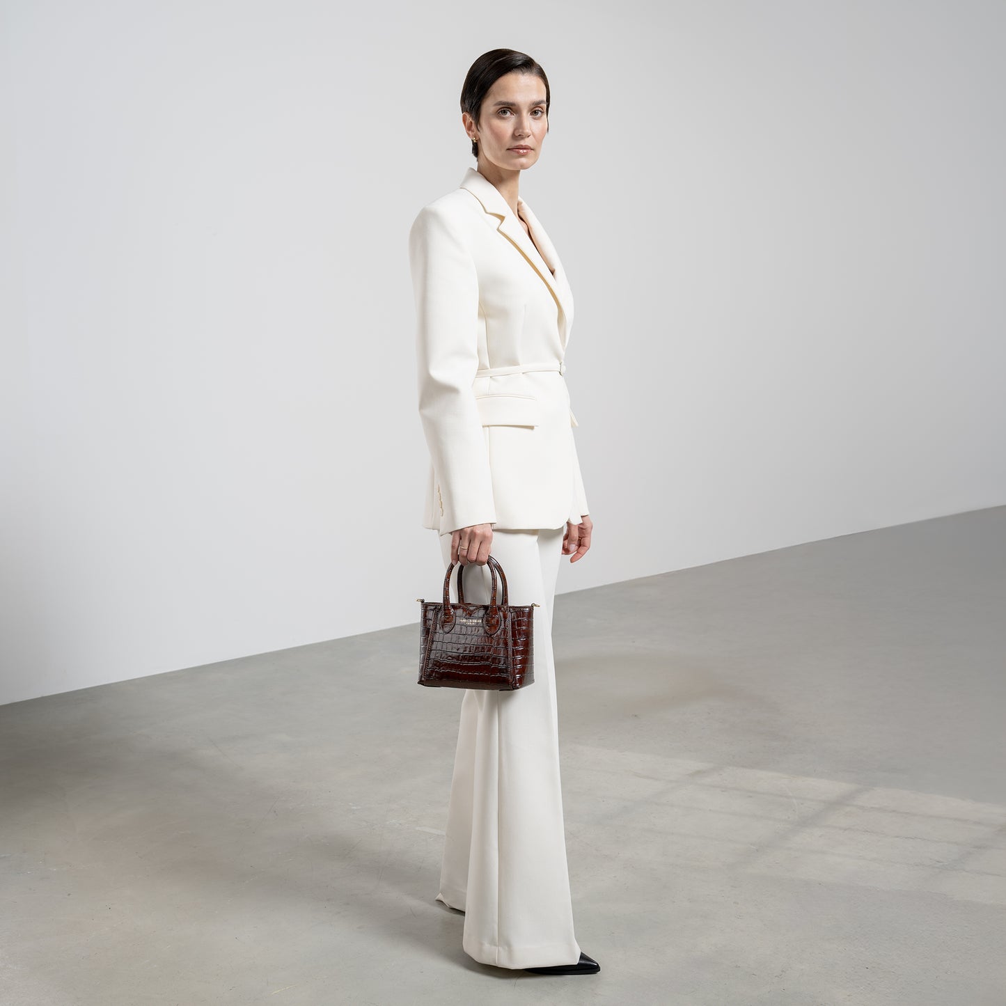 Verfijnd en compact, de Bruine Croco Kalfsleren Handtas combineert elegantie en functionaliteit moeiteloos. Vervaardigd uit premium croco-reliëf kalfsleer, biedt deze tas een stijlvolle oplossing voor je dagelijkse essentials.