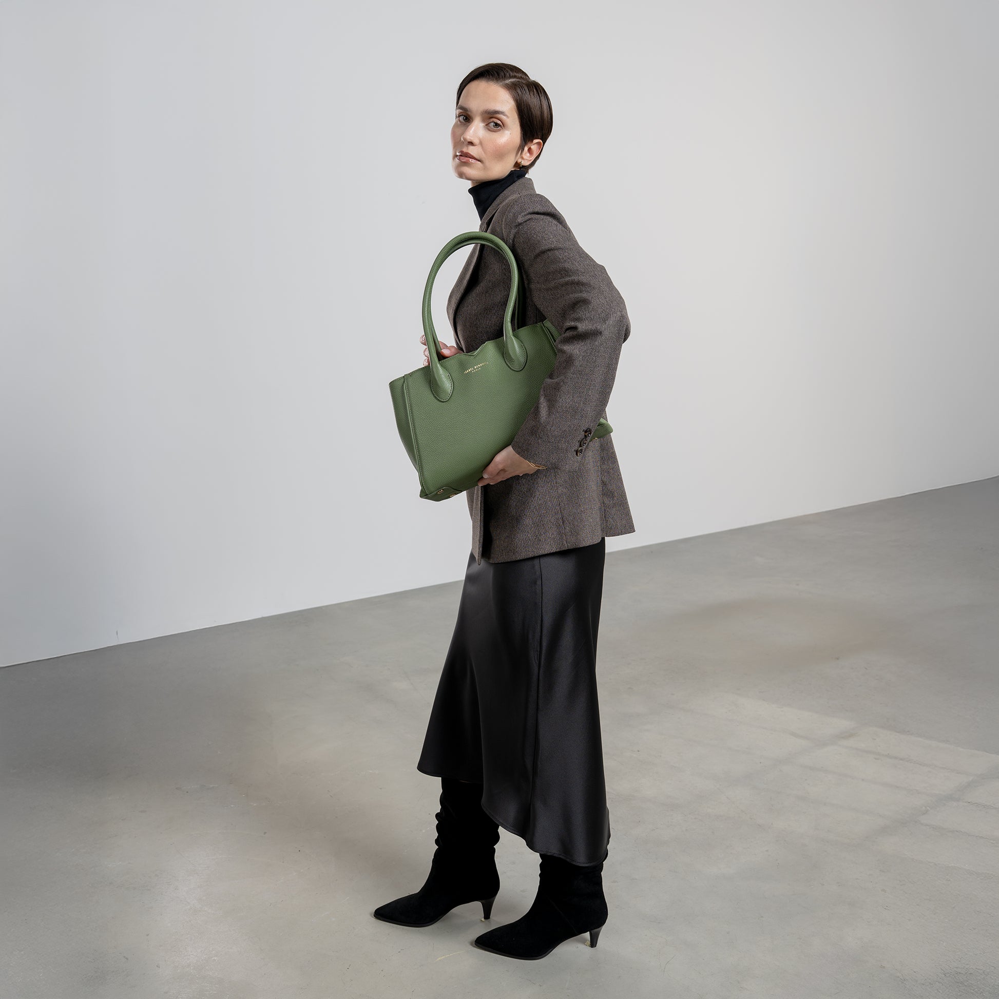 Verfijnd en compact, de Groene Kalfsleren Handtas combineert elegantie en functionaliteit moeiteloos. Vervaardigd uit premium kalfsleer, biedt deze tas een stijlvolle oplossing voor je dagelijkse essentials.