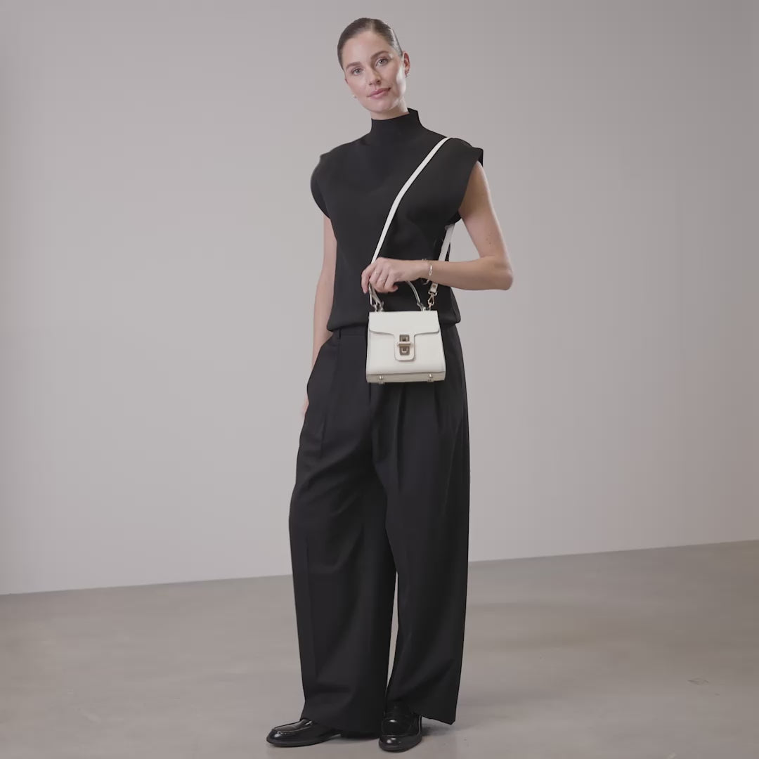 Ervaar tijdloze elegantie met de Femme Forte Simone Mini handtas, vervaardigd uit hoogwaardig wit kalfsleer. Het Italiaanse ontwerp en de nauwgezette afwerking maken het een essentieel accessoire voor de verfijnde, professionele vrouw.
