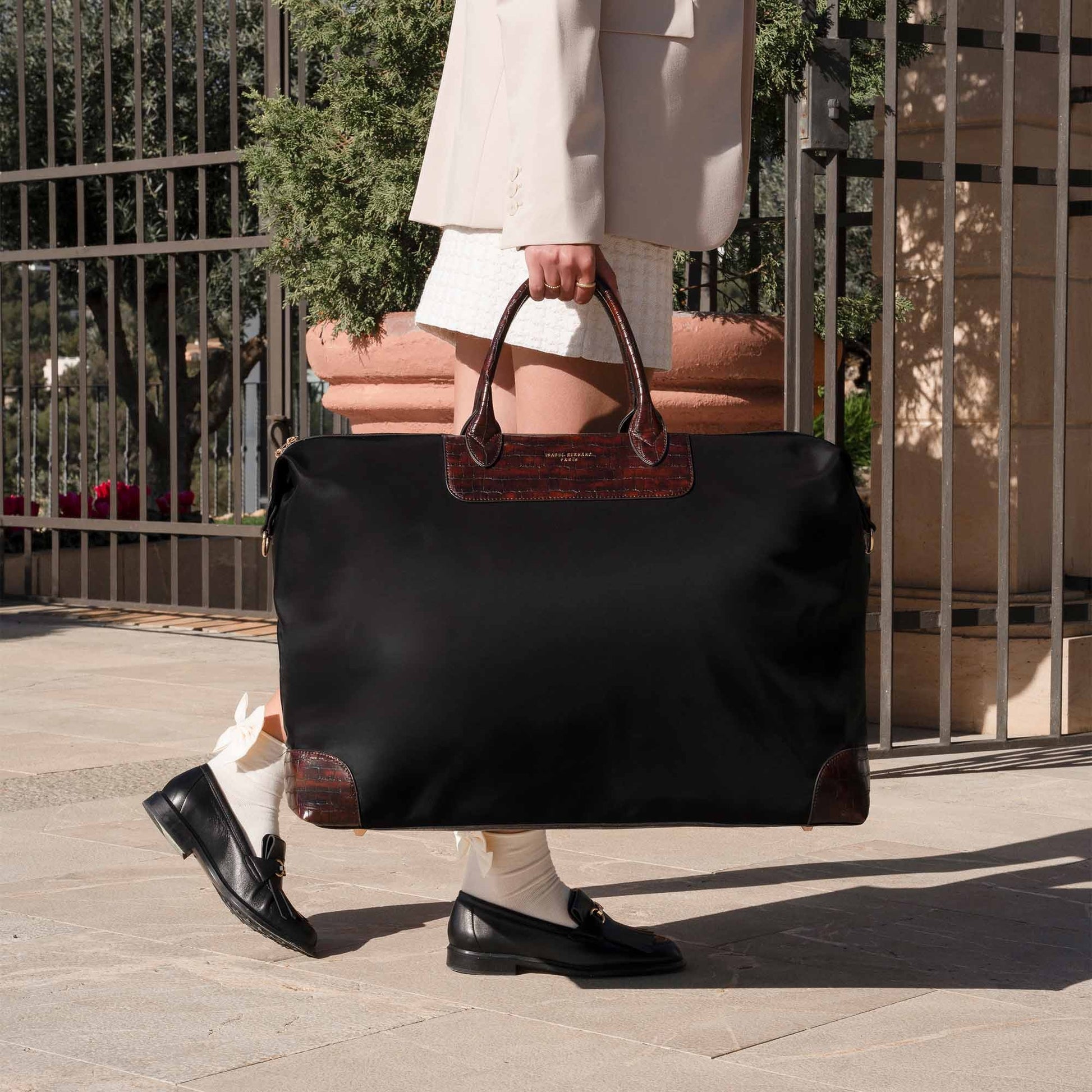 The medium-sized Du Louvre black travel bag is the perfect companion for a weekend getaway. Crafted from a premium combination of nylon and PU leather, this bag is both durable and lightweight. Nylon offers strong resistance to abrasion and is easy to clean, while PU leather provides a luxurious look. The interior is lined with soft polycotton, offering both protection and style.
