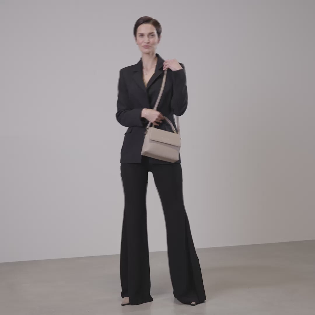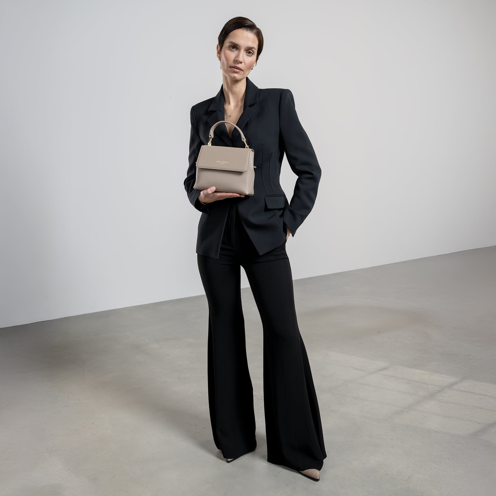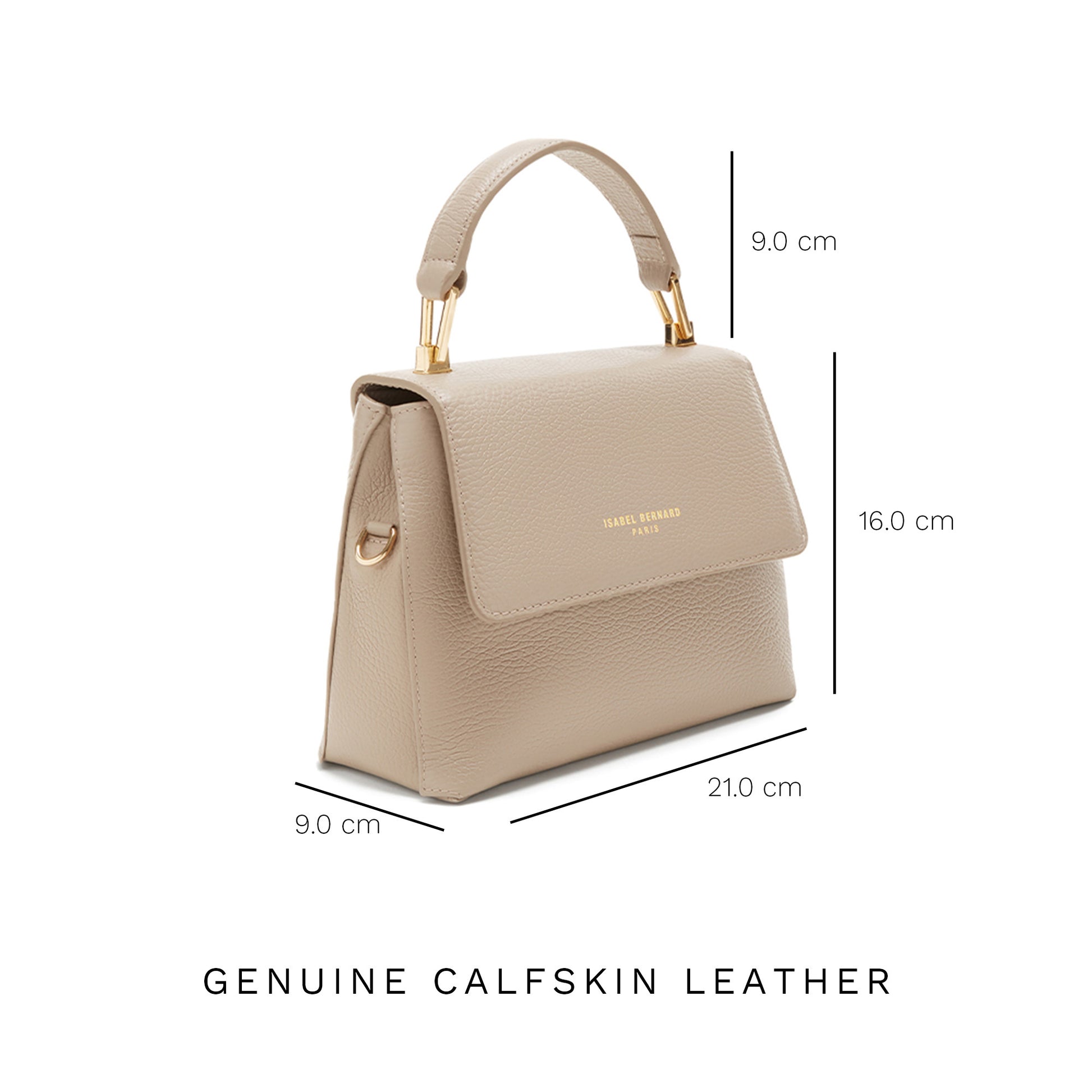 Experience timeless elegance with the Femme Forte Heline handbag, crafted from premium taupe calfskin leather. Its Italian design and meticulous craftsmanship make it an essential accessory for the sophisticated professional woman.