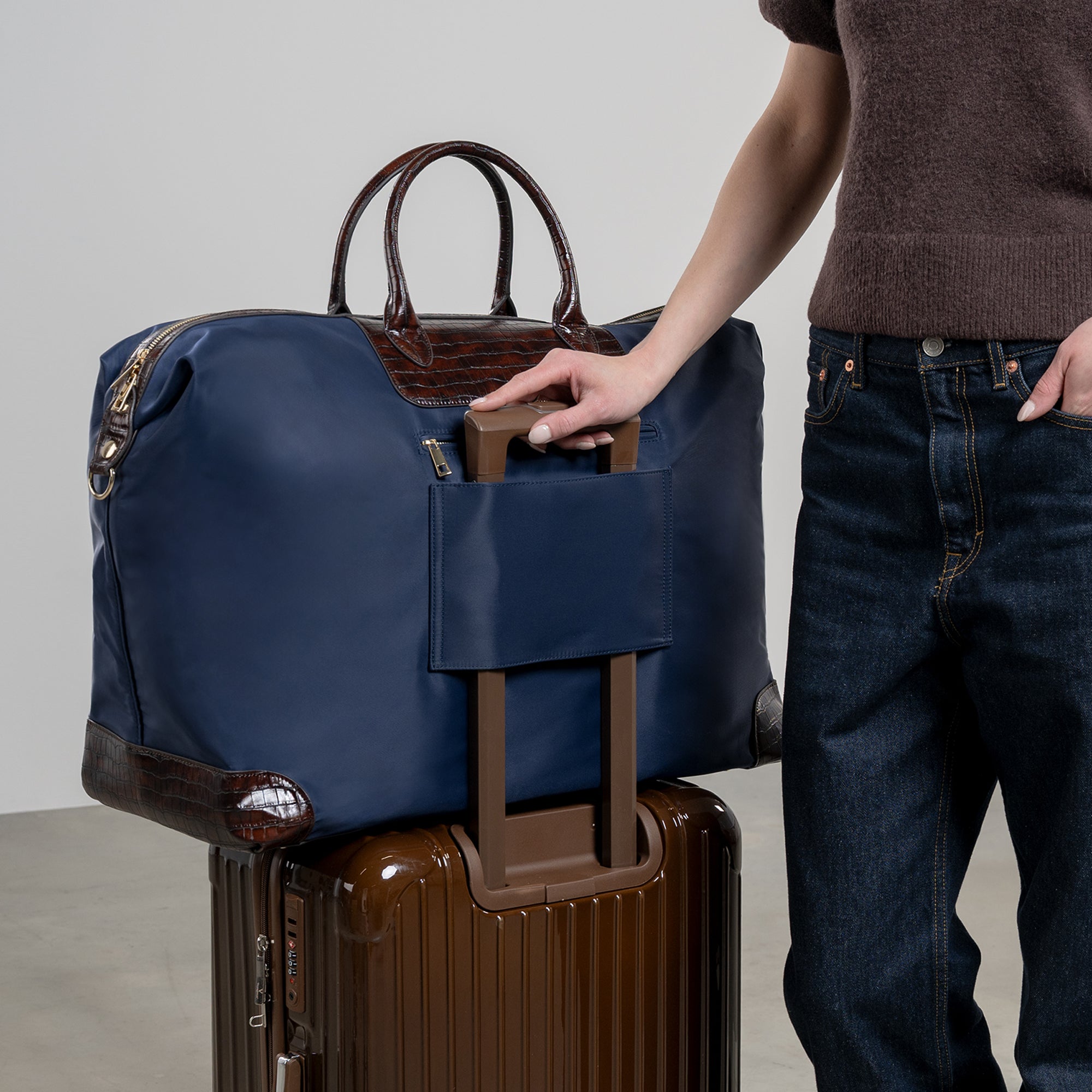 Descubra o parceiro de viagem perfeito com os nossos sacos de viagem Du Louvre! Também disponível nos tamanhos: pequeno e médio, e em preto intemporal, azul elegante e taupe elegante.