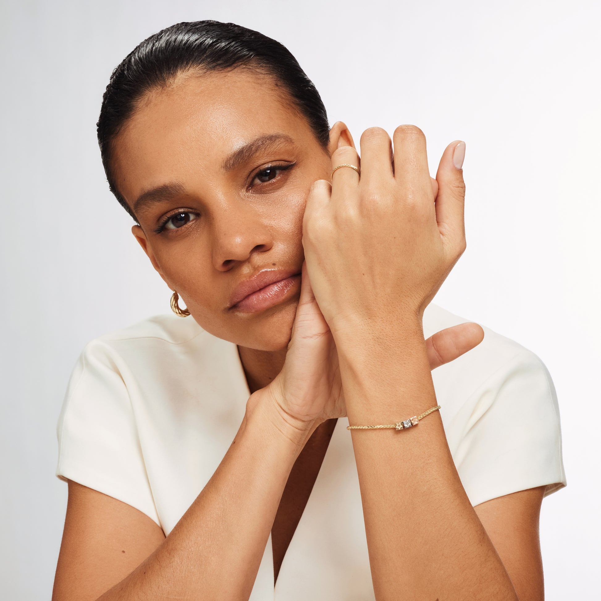 Vitt guld skimrar med en lysande silverglans och varaktig styrka, helt tillverkat av massivt guld för att utstråla modern lockelse och tidlös elegans.